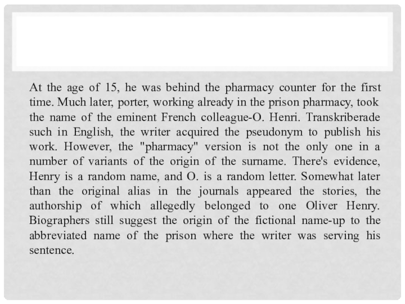 for the first time. Much later, porter, working already in the prison pharmacy, took the name of the eminent French colleague-O. Henri. Transkriberade such in English, the writer acquired the pseudonym to publish his work. However, the "pharmacy" version is not the only one in a number of variants of the origin of the surname. There's evidence, Henry is a random name, and O. is a random letter. Somewhat later than the original alias in the journals appeared the stories, the authorship of which allegedly belonged to one Oliver Henry. Biographers still suggest the origin of the fictional name-up to the abbreviated name of the prison where the writer was serving his sentence.