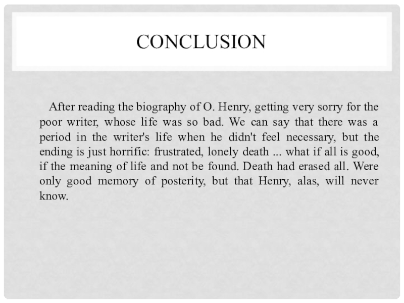 O. Henry, getting very sorry for the poor writer, whose life was so bad. We can say that there was a period in the writer's life when he didn't feel necessary, but the ending is just horrific: frustrated, lonely death ... what if all is good, if the meaning of life and not be found. Death had erased all. Were only good memory of posterity, but that Henry, alas, will never know.