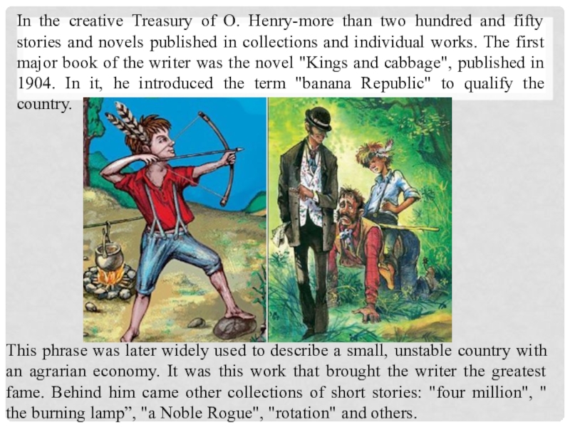 fifty stories and novels published in collections and individual works. The first major book of the writer was the novel "Kings and cabbage", published in 1904. In it, he introduced the term "banana Republic" to qualify the country.