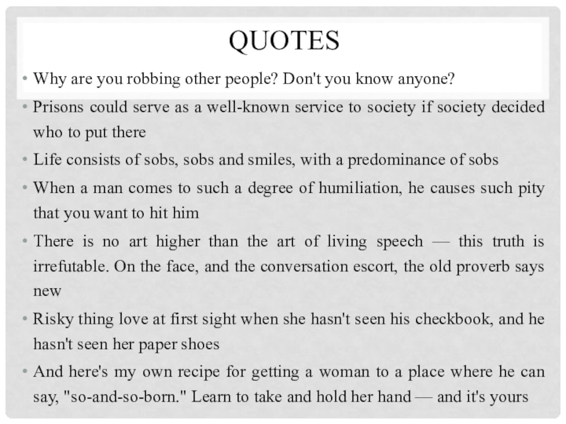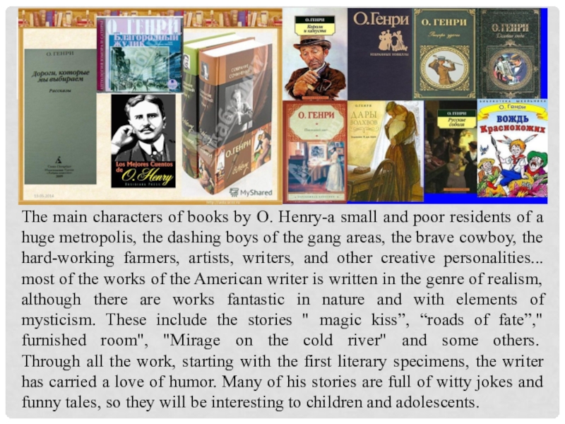 residents of a huge metropolis, the dashing boys of the gang areas, the brave cowboy, the hard-working farmers, artists, writers, and other creative personalities... most of the works of the American writer is written in the genre of realism, although there are works fantastic in nature and with elements of mysticism. These include the stories " magic kiss”, “roads of fate”," furnished room", "Mirage on the cold river" and some others.