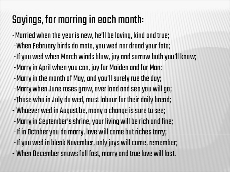 Sayings, for marring in each month:-Married when the year is new, he’ll be loving, kind and true;