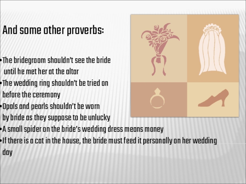 And some other proverbs: The bridegroom shouldn’t see the bride until he met her at the altarThe