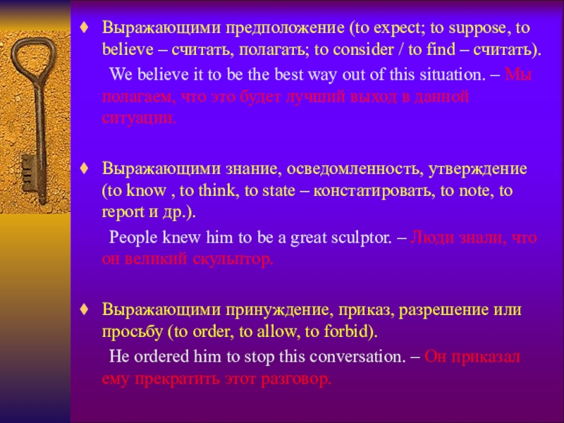 Слайд 8Выражающими предположение (to expect; to suppose, to believe – считать, полагать;