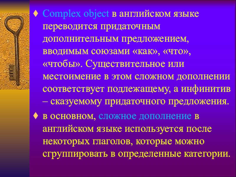 Слайд 4Complex object в английском языке переводится придаточным дополнительным предложением, вводимым союзами