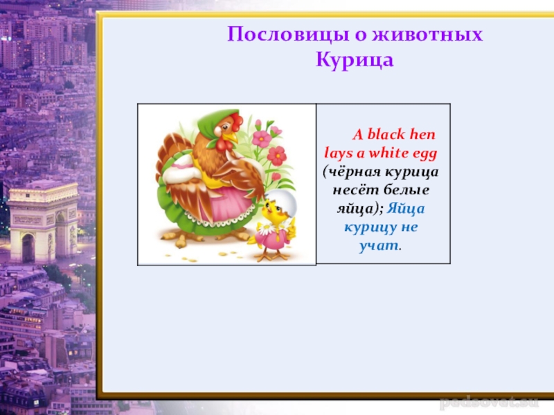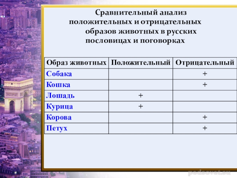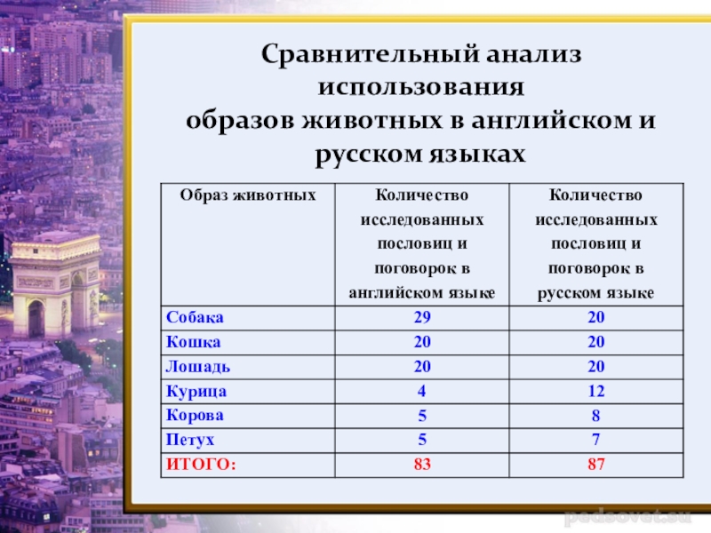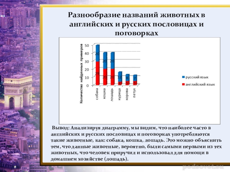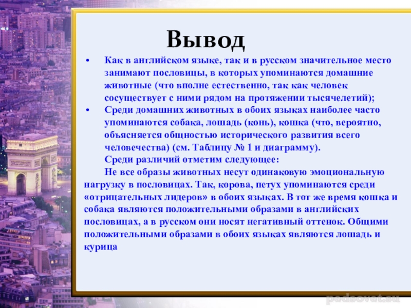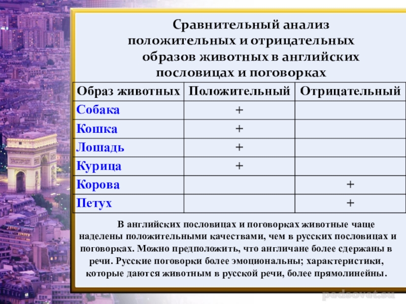 В английских пословицах и поговорках животные чаще наделены положительными качествами, чем в русских пословицах и поговорках. Можно предположить, что англичане более сдержаны в речи. Русские поговорки более эмоциональны; характеристики, которые даются животным в русской речи, более прямолинейны.