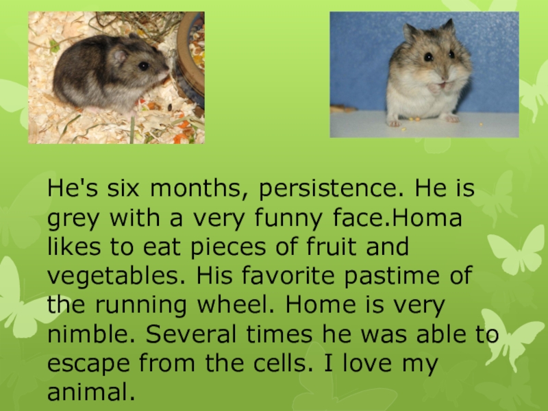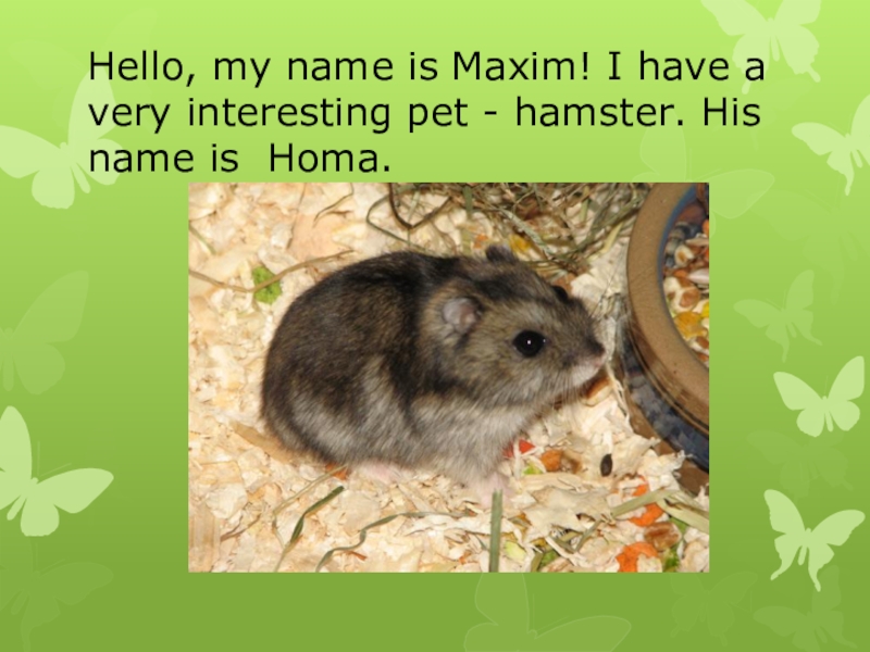Hello, my name is Maxim! I have a very interesting pet - hamster. His name is Homa.