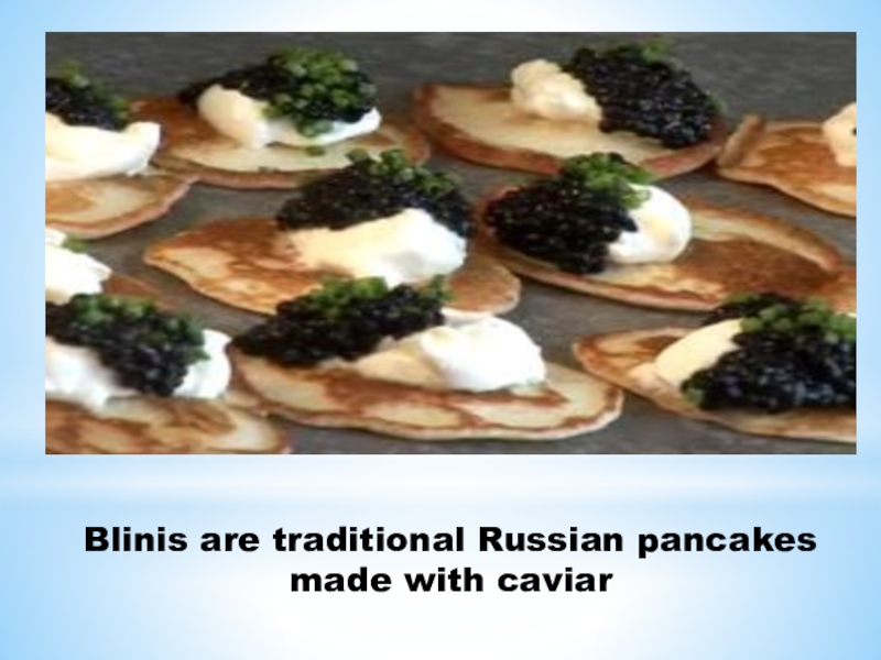 Слайд 2Blinis are traditional Russian pancakes made with caviar