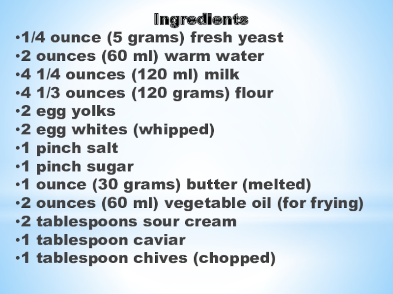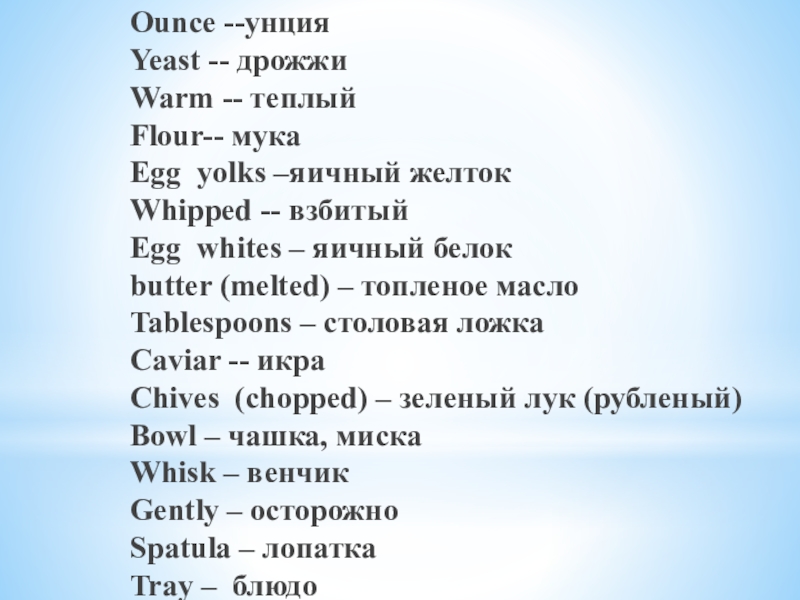 Ounce --унцияYeast -- дрожжиWarm -- теплыйFlour-- мукаEgg yolks –яичный желтокWhipped -- взбитыйEgg whites – яичный белокbutter (melted)
