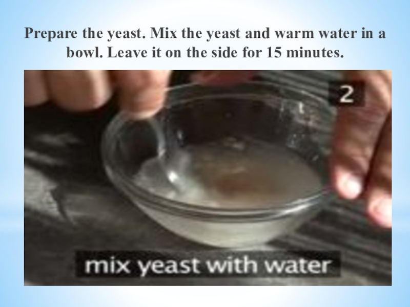 Слайд 5Prepare the yeast. Mix the yeast and warm water in a bowl.