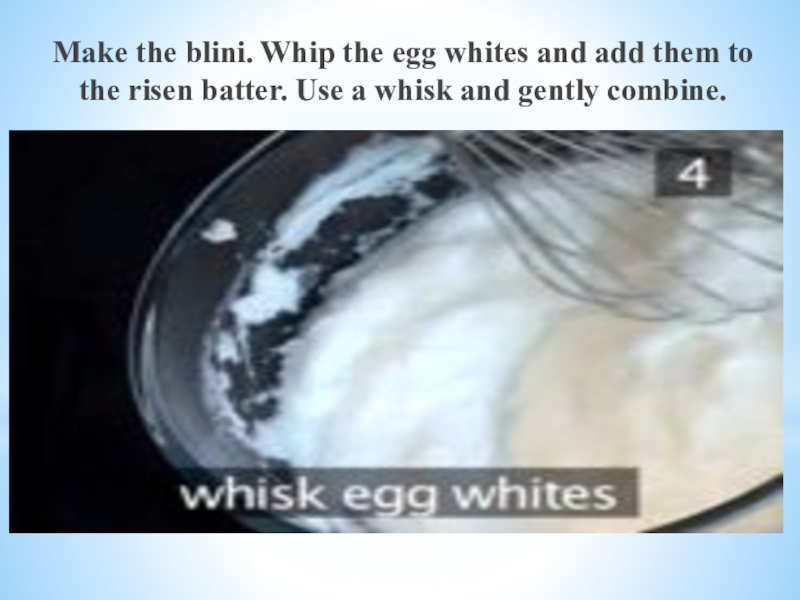 Слайд 7Make the blini. Whip the egg whites and add them to the