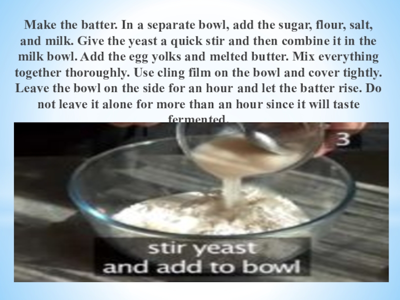 and milk. Give the yeast a quick stir and then combine it in the milk bowl. Add the egg yolks and melted butter. Mix everything together thoroughly. Use cling film on the bowl and cover tightly. Leave the bowl on the side for an hour and let the batter rise. Do not leave it alone for more than an hour since it will taste fermented.