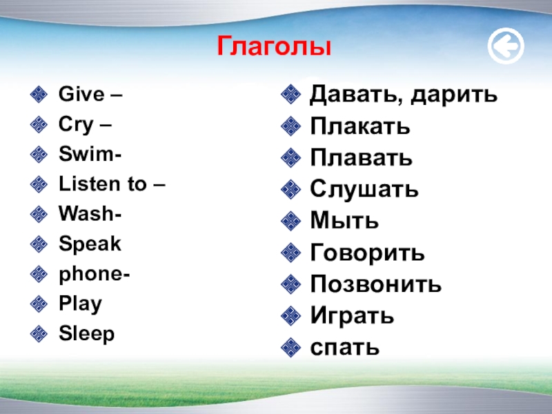 ГлаголыGive – Cry –Swim-Listen to –Wash-Speakphone-PlaySleepДавать, даритьПлакать ПлаватьСлушатьМытьГоворитьПозвонитьИгратьспать