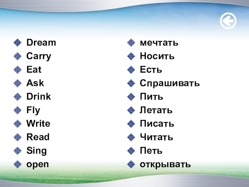 DreamCarryEatAskDrinkFlyWriteReadSingopenмечтатьНоситьЕстьСпрашиватьПитьЛетатьПисатьЧитатьПетьоткрывать