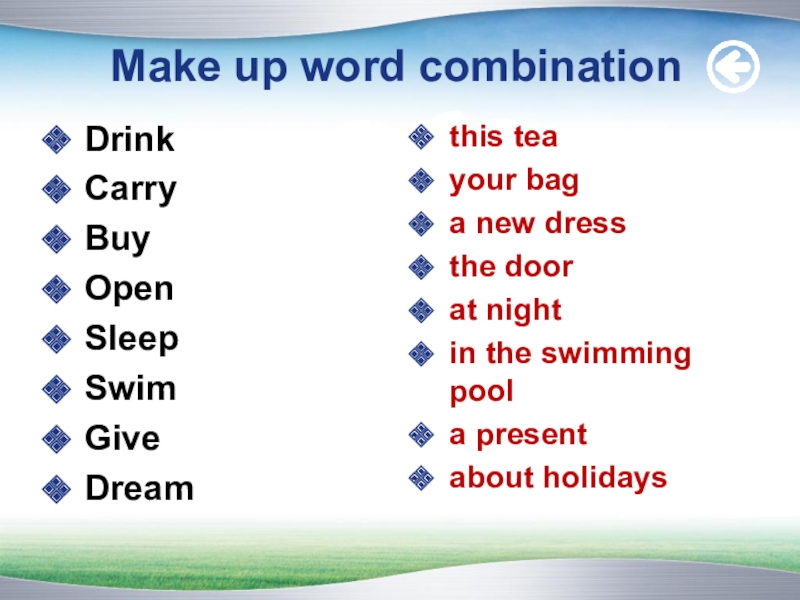Make up word combinationDrinkCarryBuyOpenSleepSwimGiveDreamthis teayour baga new dressthe doorat nightin the swimming poola presentabout holidays