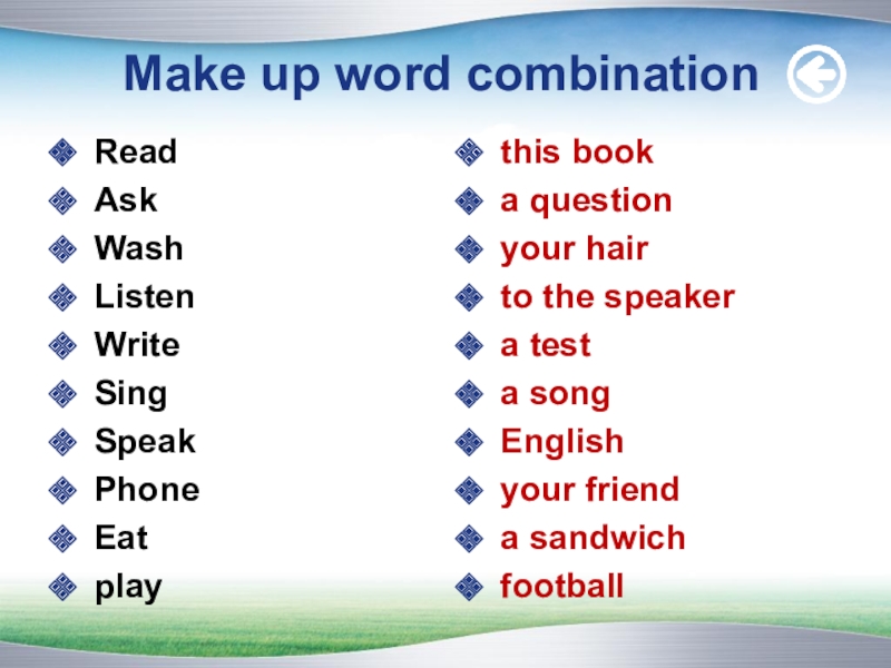 Make up word combinationReadAskWashListenWriteSingSpeakPhoneEatplaythis booka questionyour hairto the speakera testa songEnglishyour frienda sandwichfootball