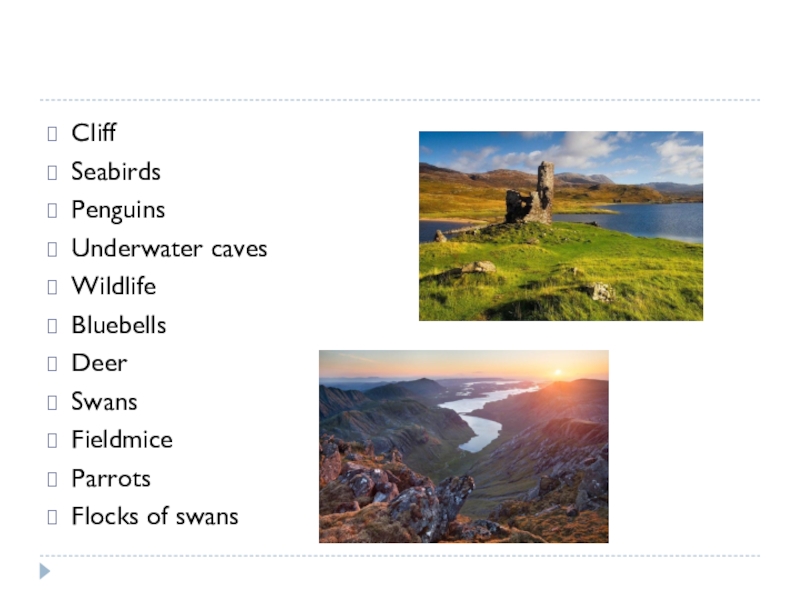 Cliff			SeabirdsPenguinsUnderwater cavesWildlifeBluebellsDeerSwans Fieldmice ParrotsFlocks of swans