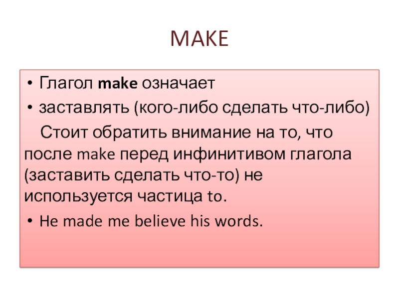 MAKEГлагол make означает заставлять (кого-либо сделать что-либо)  Стоит обратить внимание на то, что после make перед инфинитивом глагола