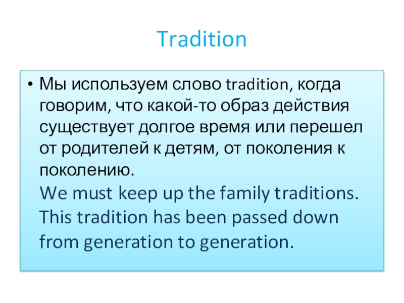 долгое время или перешел от родителей к детям, от поколения к поколению. We must keep up the family traditions. This tradition has been passed down from generation to generation.