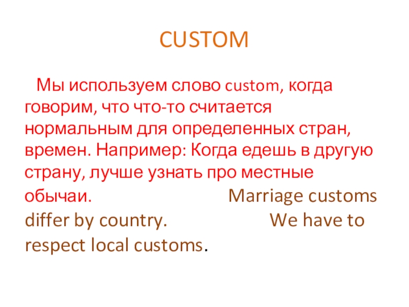 CUSTOM  Мы используем слово custom, когда говорим, что что-то считается нормальным для определенных стран, времен. Например: