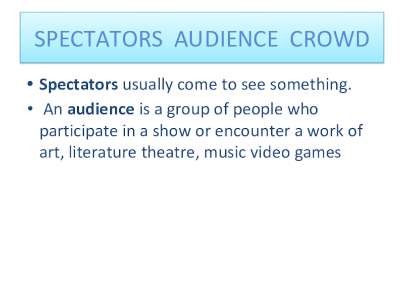 SPECTATORS AUDIENCE CROWDSpectators usually come to see something. An audience is a group of people who participate in a show