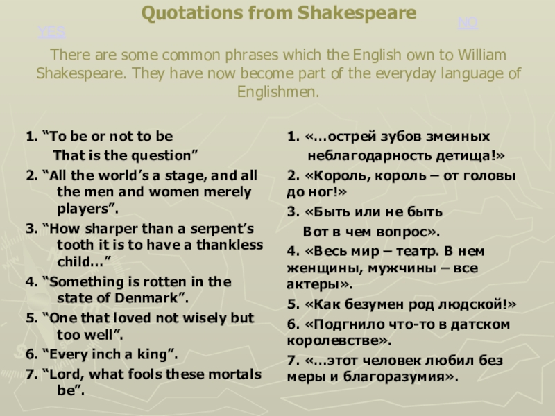 There are some common phrases which the English own to William Shakespeare. They have now become part of the everyday language of Englishmen.
