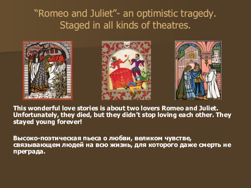This wonderful love stories is about two lovers Romeo and Juliet. Unfortunately, they died, but they didn’t stop loving each other. They stayed young forever!