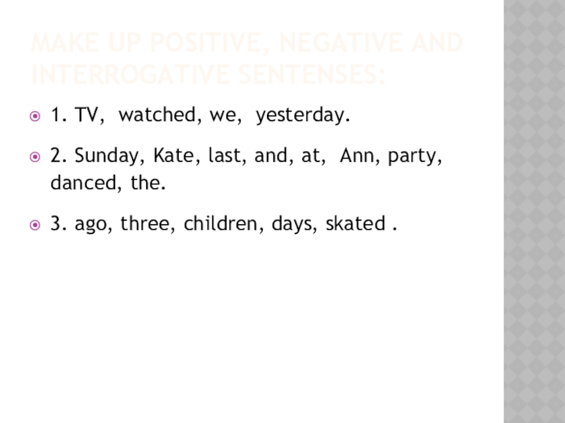 Слайд 8Make up positive, negative and interrogative sentenses: