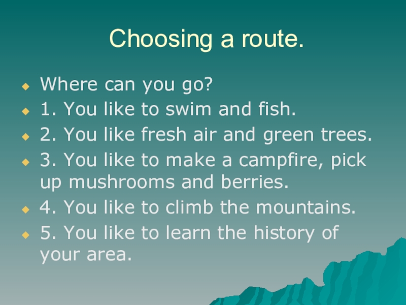 Choosing a route.Where can you go?1. You like to swim and fish.2. You like fresh air and