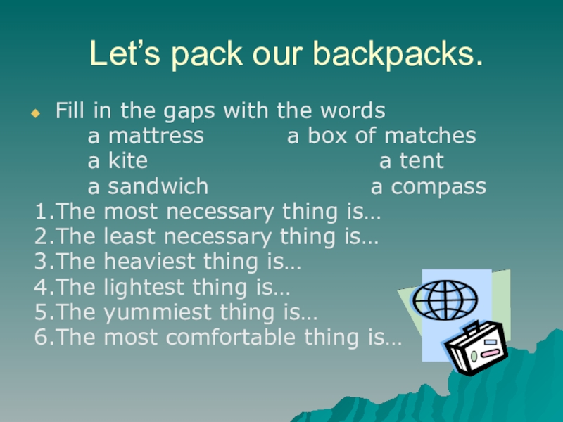 Let’s pack our backpacks.Fill in the gaps with the words    a mattress