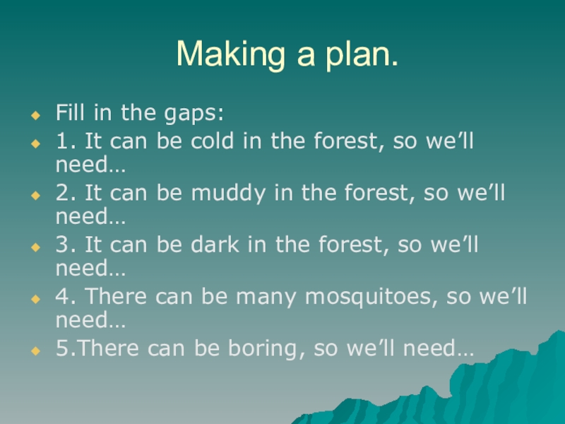 Making a plan.Fill in the gaps:1. It can be cold in the forest, so we’ll need…2. It