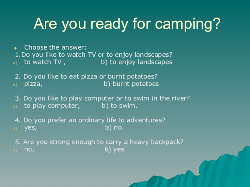 Are you ready for camping?Choose the answer:1.Do you like to watch TV or to enjoy landscapes?to watch TV , b) to enjoy landscapes2. Do you like to eat pizza