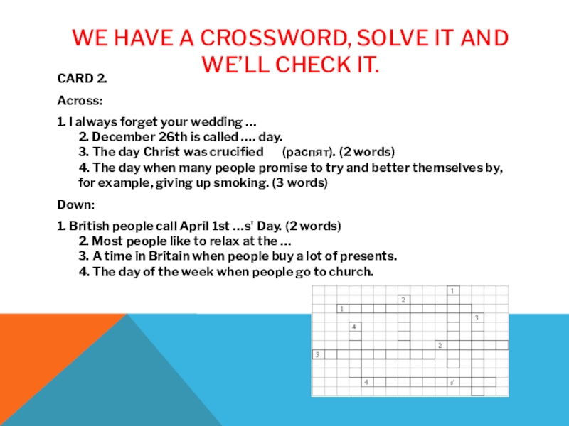 Слайд 15We have a crossword, solve it and we’ll check it.