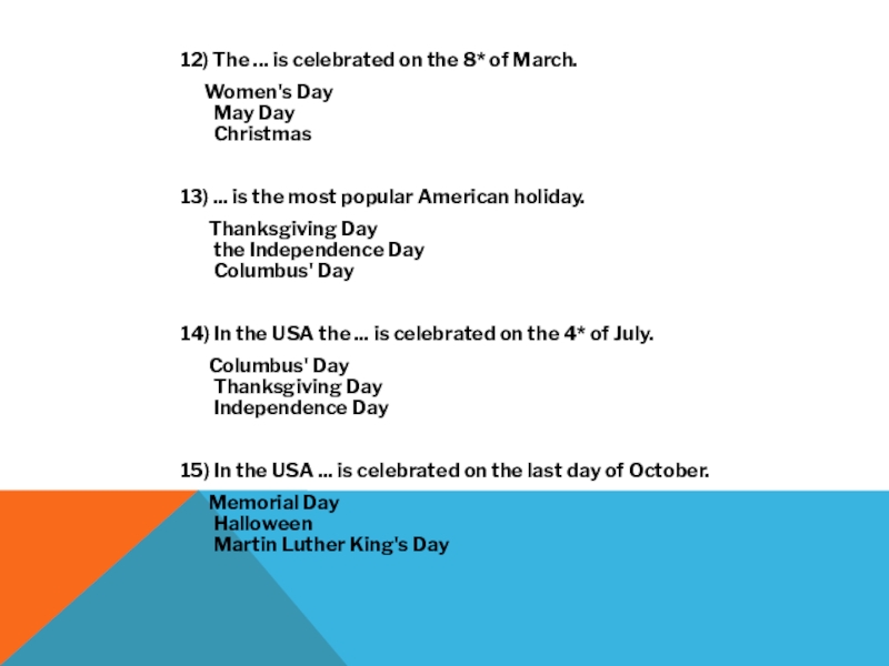 Слайд 912) The ... is celebrated on the 8* of March.