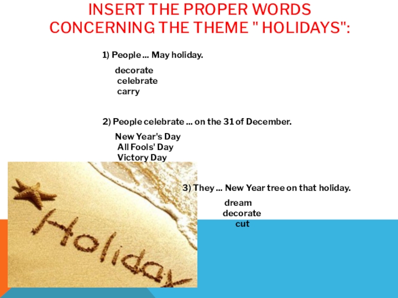 Слайд 6Insert the proper words concerning the theme " Holidays":
