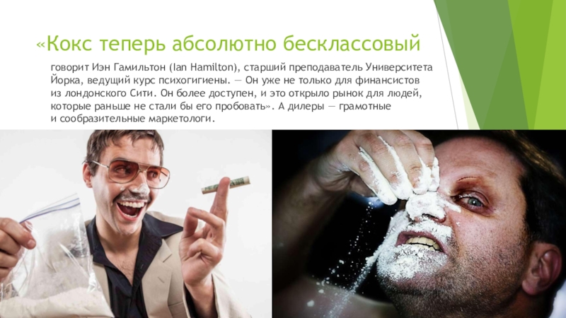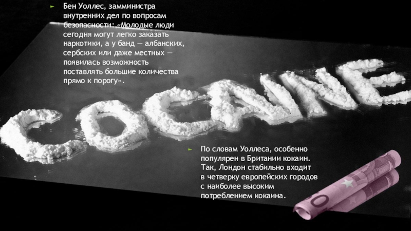 По словам Уоллеса, особенно популярен в Британии кокаин. Так, Лондон стабильно входит в четверку европейских городов с наиболее высоким потреблением кокаина.