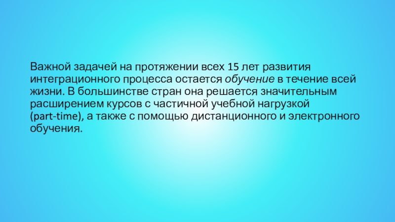 обучение в течение всей жизни. В большинстве стран она решается значительным расширением курсов с частичной учебной нагрузкой (part-time), а также с помощью дистанционного и электронного обучения.