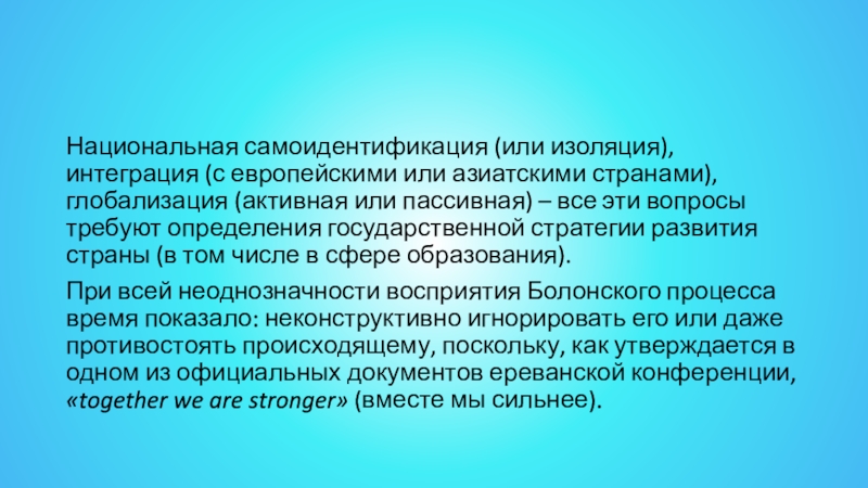 При всей неоднозначности восприятия Болонского процесса время показало: неконструктивно игнорировать его или даже противостоять происходящему, поскольку, как утверждается в одном из официальных документов ереванской конференции, «together we are stronger» (вместе мы сильнее).