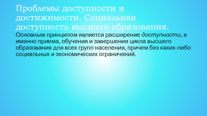 Слайд 9Проблемы доступности и достижимости. Социальная доступность высшего образования.