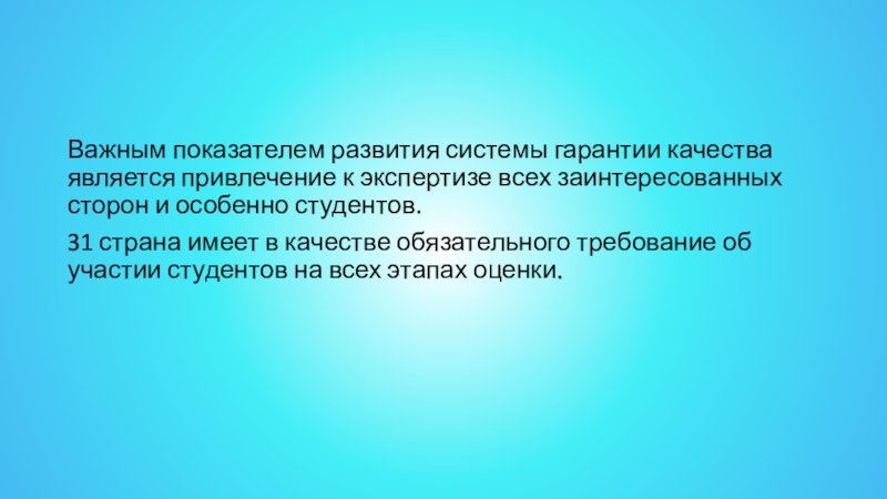Слайд 15Важным показателем развития системы гарантии качества является привлечение к экспертизе всех