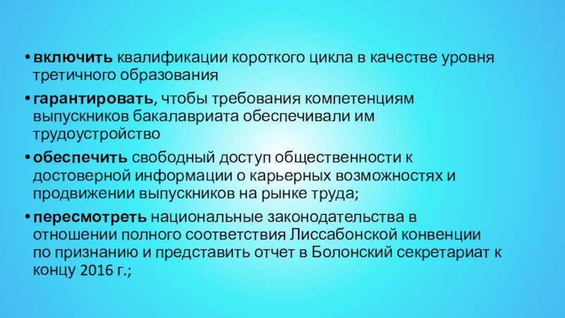 Слайд 6включить квалификации короткого цикла в качестве уровня третичного образования