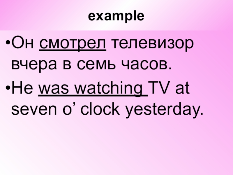exampleОн смотрел телевизор вчера в семь часов.He was watching TV at seven o’ clock yesterday.