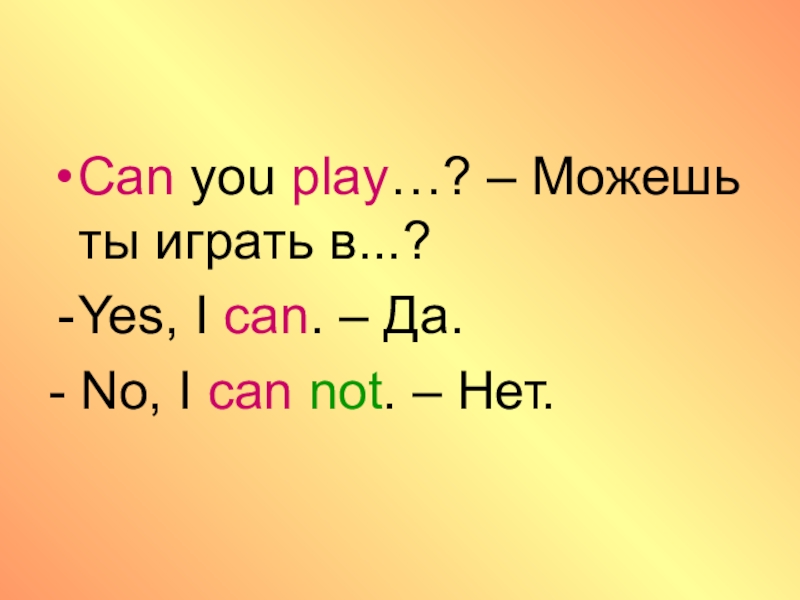 Can you play…? – Можешь ты играть в...?Yes, I can. – Да.- No, I can not. –
