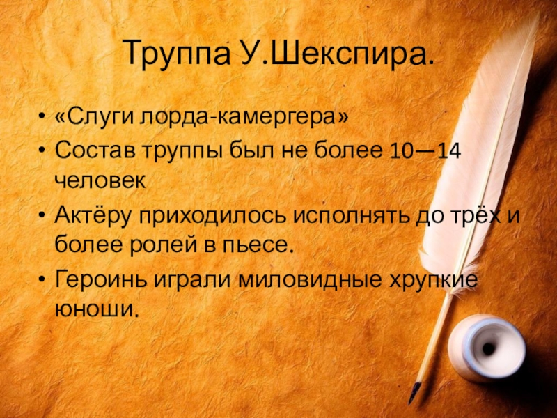 Труппа У.Шекспира.«Слуги лорда-камергера»Состав труппы был не более 10—14 человекАктёру приходилось исполнять до трёх и более ролей в
