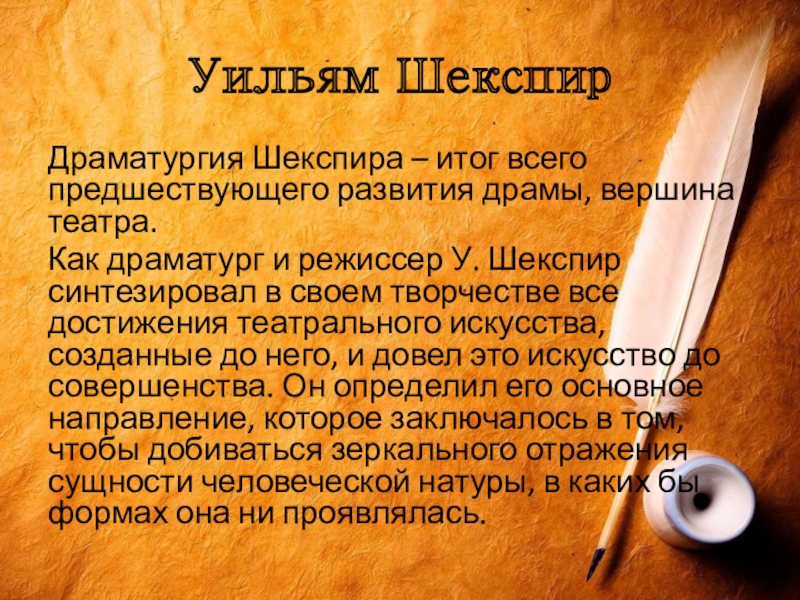 драматург и режиссер У. Шекспир синтезировал в своем творчестве все достижения театрального искусства, созданные до него, и довел это искусство до совершенства. Он определил его основное направление, которое заключалось в том, чтобы добиваться зеркального отражения сущности человеческой натуры, в каких бы формах она ни проявлялась.