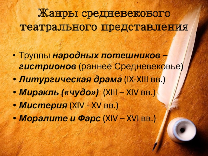 Жанры средневекового театрального представленияТруппы народных потешников – гистрионов (раннее Средневековье)Литургическая драма (IX-XIII вв.)Миракль («чудо») (XIII – XIV вв.)Мистерия