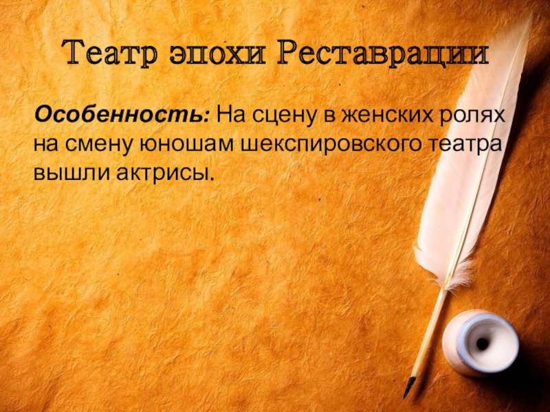 Театр эпохи РеставрацииОсобенность: На сцену в женских ролях на смену юношам шекспировского театра вышли актрисы.