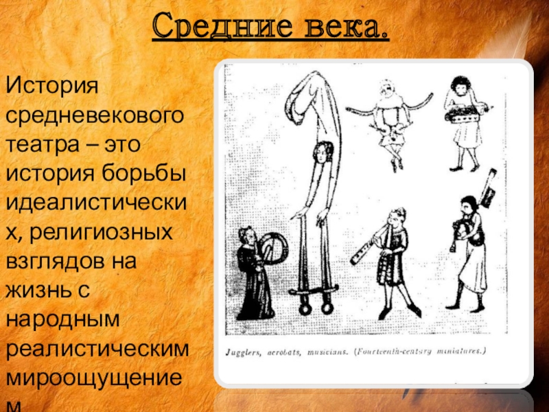 Средние века.История средневекового театра – это история борьбы идеалистических, религиозных взглядов на жизнь с народным реалистическим мироощущением