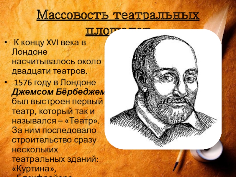Массовость театральных площадок К концу XVI века в Лондоне насчитывалось около двадцати театров. 1576 году в Лондоне