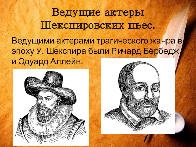 Ведущие актеры Шекспировских пьес.Ведущими актерами трагического жанра в эпоху У. Шекспира были Ричард Бёрбедж и Эдуард Аллейн.