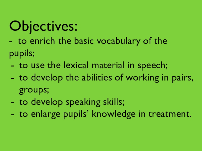 Objectives:- to enrich the basic vocabulary of the pupils;to use the lexical material in speech;to develop the